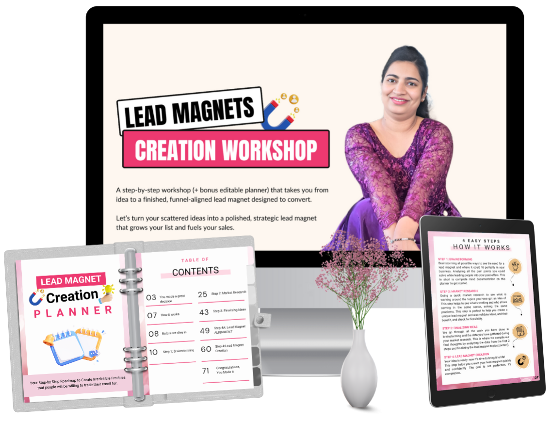 This workshop is designed to be actionable and efficient. In just 60 minutes, you’ll have a clear plan—and with the Lead Magnet Creation Planner, you can move step by step without overwhelm. No fluff, just results.
