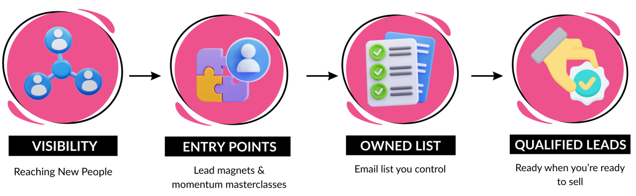 The Aligned List Method guides how visibility, entry points, list growth, and nurture come together to help you build the infrastructure in a way that fits your business, your time, and your capacity.