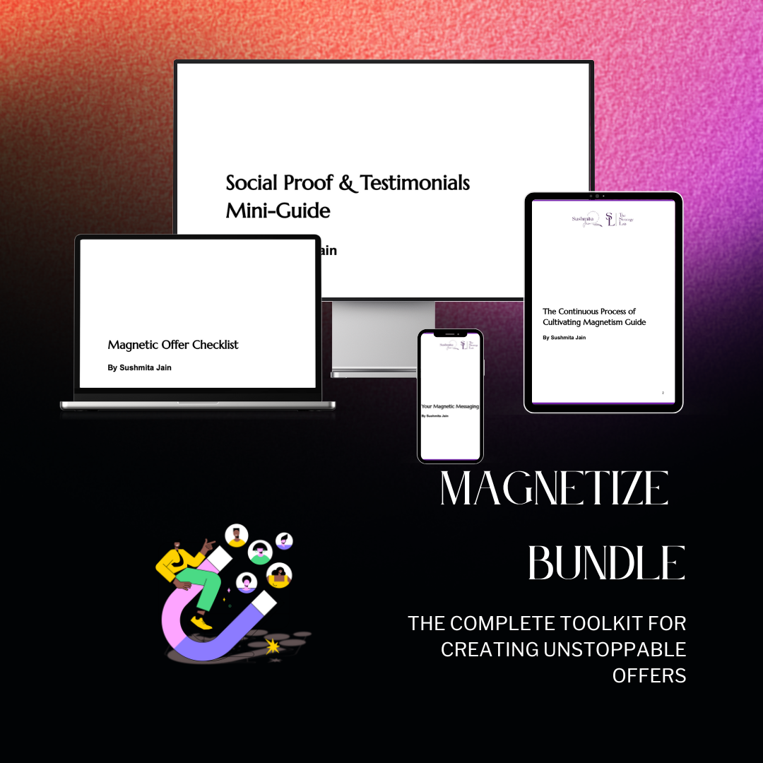 The Magnetize Bundle equips you with everything you need to create offers that captivate, build trust, and inspire action. This powerful collection isn’t just about improving your sales it’s about mastering the art of attraction and crafting a brand that resonates on a deeper level. Each piece of the bundle has been designed to help you refine your approach, connect more deeply with your audience, and see tangible results in your business. If you're ready to elevate your brand’s appeal and turn interest into action, the Magnetize Bundle is your next step.