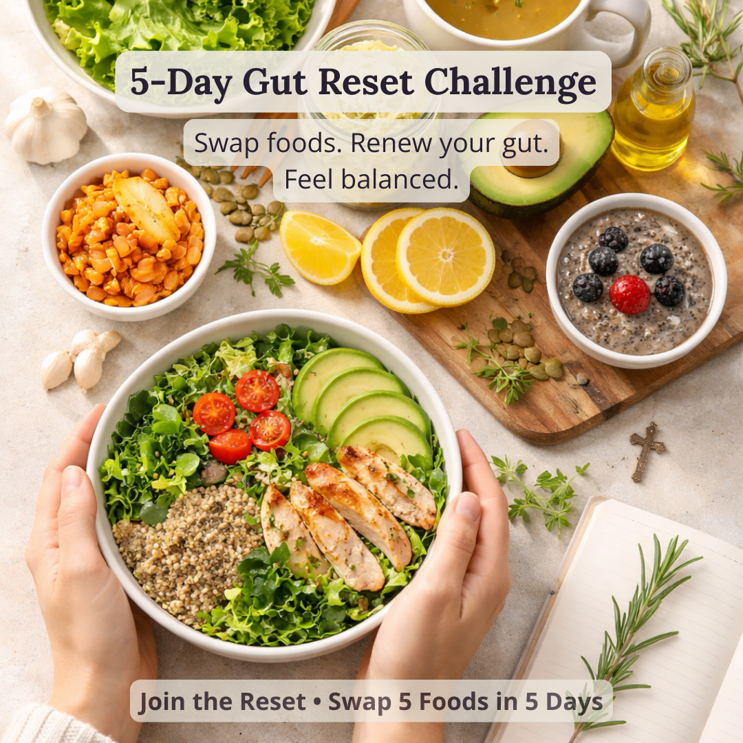 Discover how 5 simple food swaps can transform your gut health in just 5 days. This FREE faith-integrated challenge delivers one daily email with a simple swap, practical tips, and spiritual encouragement—no complicated meal plans or restrictive diets. You'll reduce bloating, increase energy, and gain hope that healing is possible. Includes FREE Symptom Tracker and Grocery Shopping Guide. Your body was designed to heal—let's show it how!
