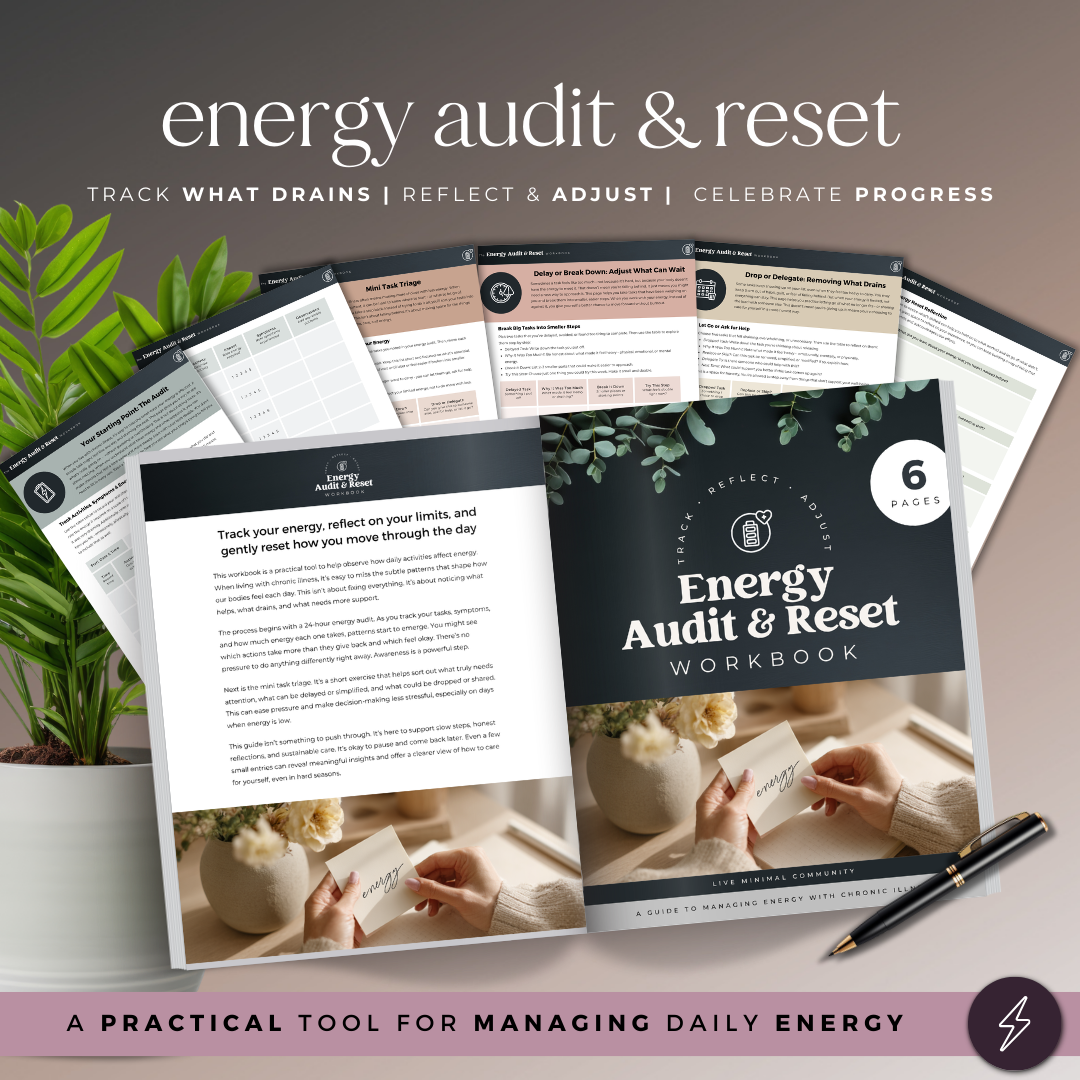 This Energy Audit & Reset workbook helps you see how daily activities affect your energy. You’ll track tasks and symptoms, reflect on patterns, and sort what needs attention, what can wait, and what can be shared or let go. Created for life with chronic illness, it offers a clear starting point for making small, realistic adjustments based on what your body shows you.
