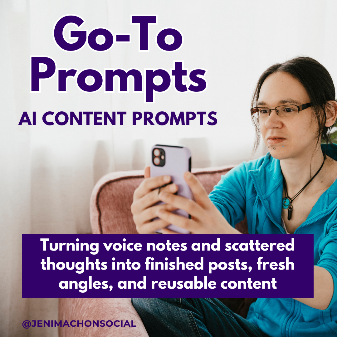 Use these strategic AI prompts to identify gaps, refine your messaging, and turn voice notes or half-ideas into clear, usable posts. Designed to support your thinking, not replace your voice