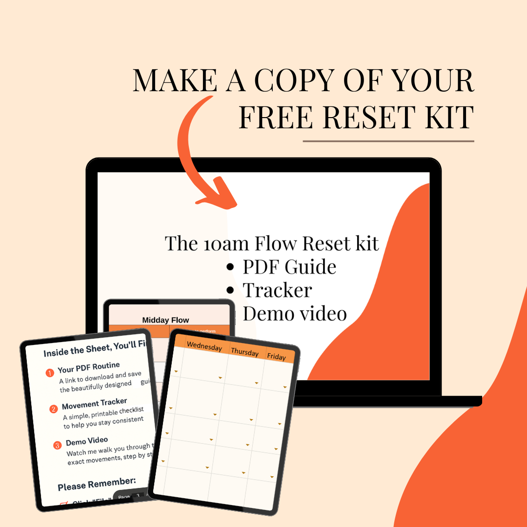 The 10AM Flow Reset is a gentle, desk-friendly morning movement routine for women over 40 who work online and sit long hours. In just 10 minutes, these simple movements help release stiffness, reset posture, and restore focus so you can move through your workday feeling more comfortable and energized. No pressure, no perfection — just a supportive pause that fits real life