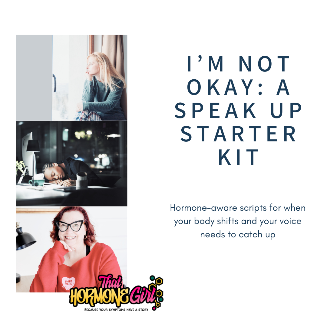I’m Not Okay: A Speak Up Starter Kit is a hormone-aware guide for women whose bodies have shifted and whose tolerance has dropped. Inside, you’ll learn simple nervous system regulation tools and real-life scripts for healthcare, relationships, and work so you can speak clearly without over-explaining, shrinking, or apologizing for having limits.
