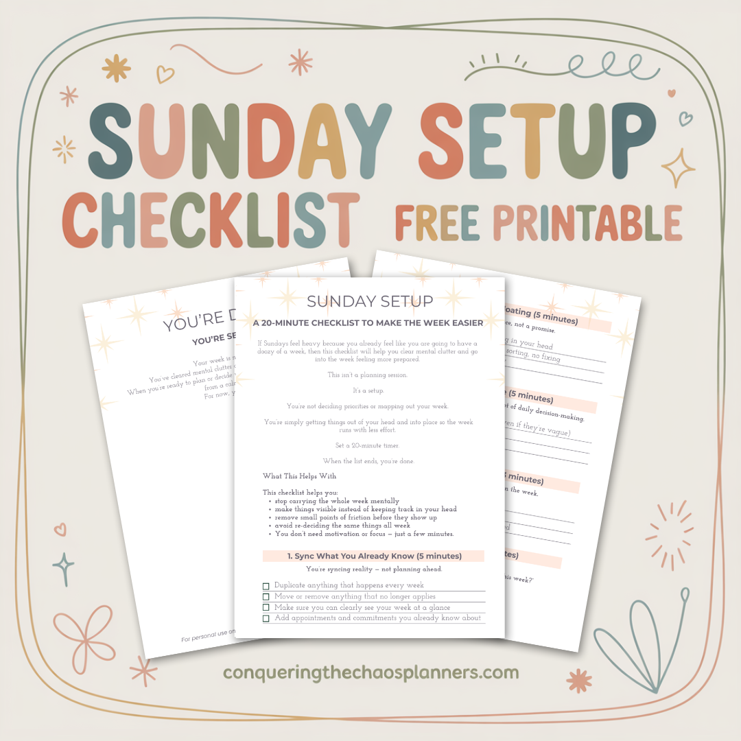 If your brain feels full heading into a new week, this checklist offers a calm, practical way to reduce mental load. The Sunday Setup Checklist is a simple, 20-minute, start-to-finish weekly setup designed to help you clear mental clutter, make the week ahead visible, and feel more prepared — without turning Sunday into a planning marathon.